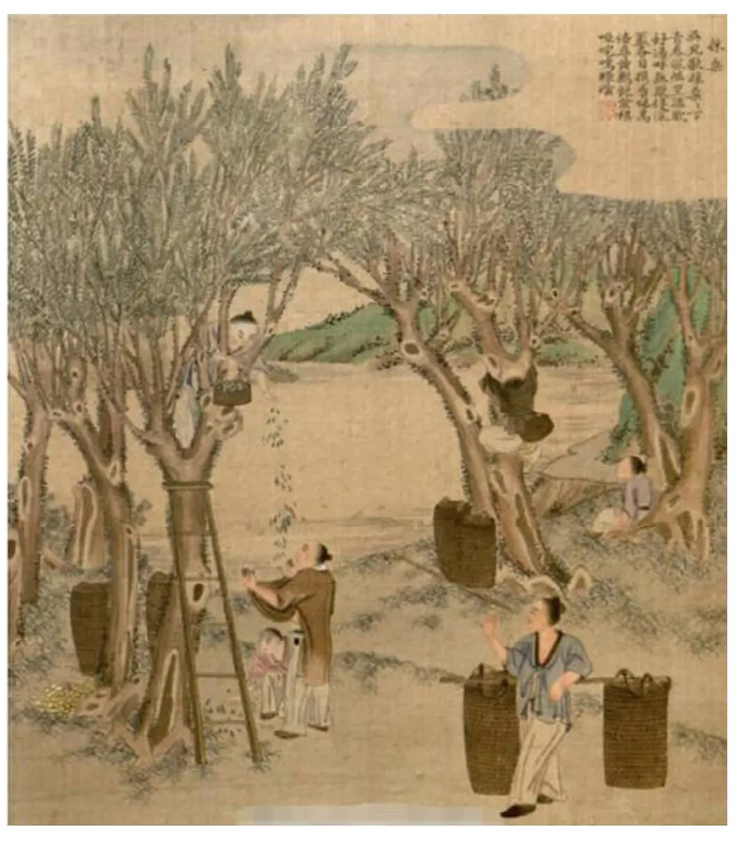 《耕织图》是古代绘画的传统题材,南宋绍兴年间楼璹出任於潜(今临安)县令,绘制《耕织图》45幅,从浸种、浴蚕直到入仓、剪帛,将耕、织的每个环节体现在绘画中,每幅图并配有五言诗一首,作为劝农的民间教材在乡里推行。此事得到皇帝嘉奖,遂得以推行。此后虽然历代官方都有劝农之举,但最著名的当为康熙、雍正两帝御制《耕织图》。康熙《耕织图》于康熙三十五年(1696)完成,由宫廷画师焦秉贞及其弟子冷枚共同绘制,其中农夫耕耘图、妇女织布图各23幅,配以康熙御制序言和董其昌体行草七言诗,装裱成册页,钤有康熙印章。根据康熙《御制耕织图序》中谈到“于丰泽园之侧治田数畦,环以溪水,阡陌井然在目,桔槔之声盈耳,岁收嘉禾数十钟。陇畔树桑,旁列蚕舍,浴蚕缫丝,恍然茅檐蔀屋。因构‘知稼轩’、‘秋云亭’以临观之”, 内容以江南农民耕稼事为原型,同时参考康熙本人于丰泽园专属农田中从事农业活动的情景绘制,属于康熙朝书画中的纪实类作品(见图6、图7)。