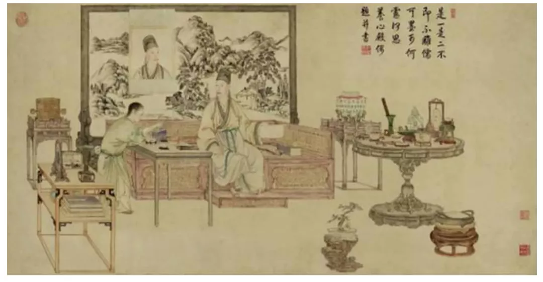 乾隆时期的宫廷画师,留下了众多他平时休憩的画像。我们根据《乾隆岁朝图》《乾隆鉴古图》(见图13、图14)、《乾隆雪景行乐图》等众多画作,可以看出他本人燕居时的发型与服饰,正是模仿明代士大夫的标准装扮。