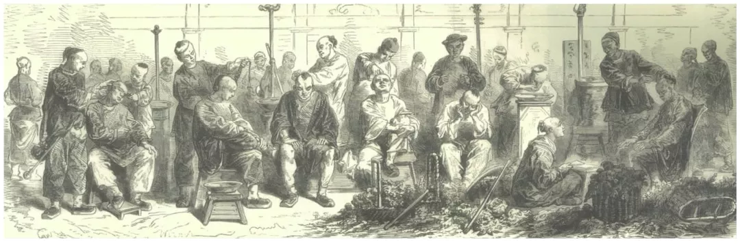 大约到了清朝后期,一些中外报刊便刊载了外交人员的中国见闻与绘画,对中国南方的社会风俗有较多反映。西方外交人员注意到广州街头的剃头匠的故事:“这些流动的剃头匠肩上背着一个袋子,里面装着剃刀、剪刀、刷子、金属材质的盆,还有一个木质或铜质的用来接头发的托盘。有时他们会用扁担挑着一个木质的小箱子,里面装着凉水和小火炉烧着的热水,以及一个放工具和肥皂的抽屉。为了保持平衡,扁担的另一头挑着一个四条腿的小长凳。第一位客人叫住了剃头匠要求理发。剃头匠立刻在街角把剃头的工具放下并铺展开来,迅速开始剃头。周围来来往往的行人并没有对他的工作造成影响,他也无须给快速经过的轿子或是背着体积庞大的包袱的苦力让路。等剃好头洗完发之后,就开始整理辫子。剃头匠将客人的辫子松开、理顺,再编起来。编好辫子,便该清洗耳朵了。”(见图18)