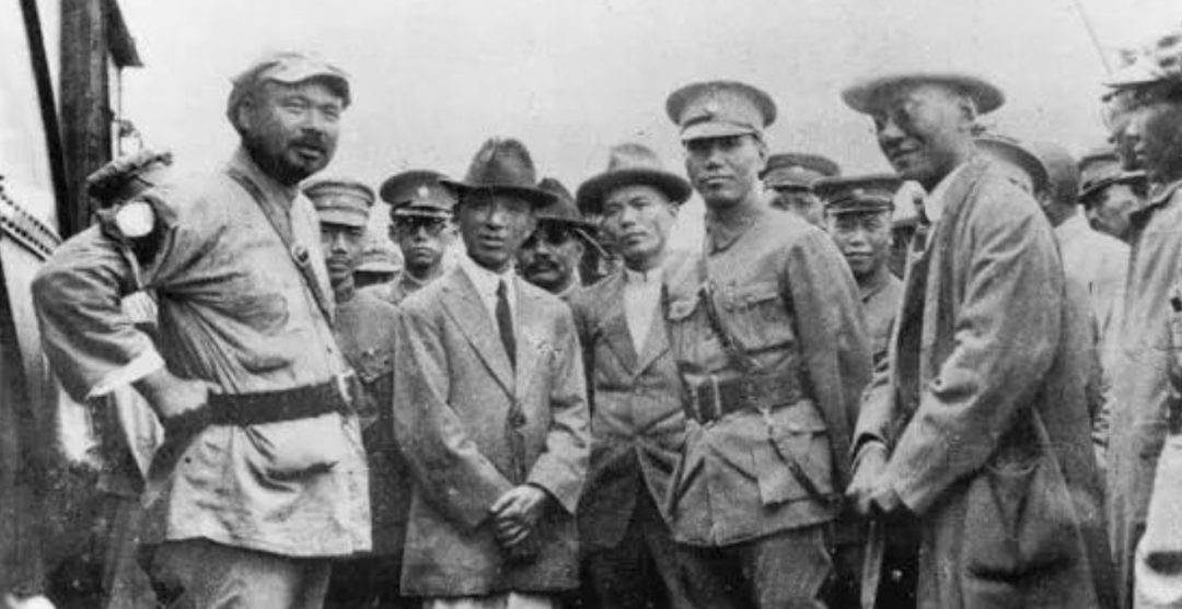 1927年冯玉祥(左一)与蒋介石(右三)会面