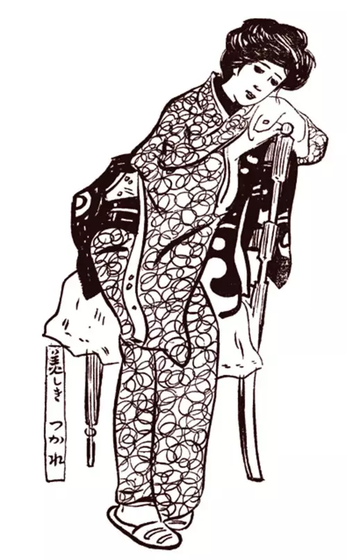 他的画正如他反复咏叹的都市女郎,身着法兰绒和服,在昏黄的街灯下缓步轻移。衣服的材质是舶来的法兰绒,却被裁剪成了和服的式样。美人被隔在玻璃窗外,隔在无边的夜色里,这样微薄的阴翳和微远的距离,柔和了女子的妖娆和法兰绒的富丽,为其笼上了朦胧的美感。这样的审美取向,不正是日本传统的趣味,《源氏物语》男女密约时悬在两人中间的一挂垂帘、平家造幽深的日式房间中传出的幽微琴声、幽暗的能乐舞台和幽玄的能乐表演,这样的阴翳和距离的审美意趣渗透在梦二的血液里,画笔一提,便流淌在了纸上。