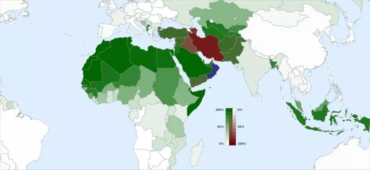 根据对最早的“四个哈里发”的看法和观点不同,伊斯兰教分成两大派,现在两派的势力范围如下: