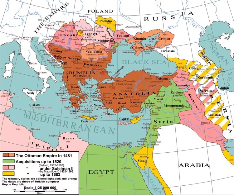 奥斯曼帝国,则开始经营原来属于两河文明,埃及文明,波斯文明,希腊罗马文明的庞大的地区,伊斯兰教,基督教-东正教,犹太教,佛教和其他宗教流行的数十个大大小小的古代国家所在地。