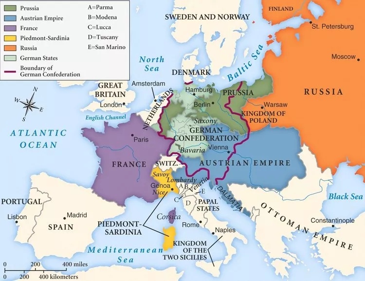 上图是1815年的维也纳会议后的欧洲势力范围:法国拿破仑刚刚失败,奥匈帝国,普鲁士和俄罗斯势力最大。