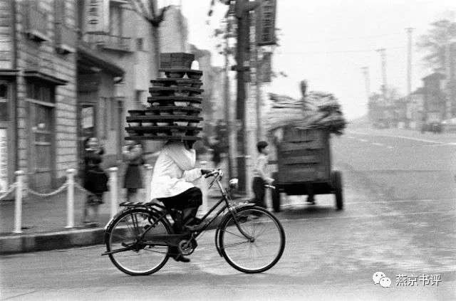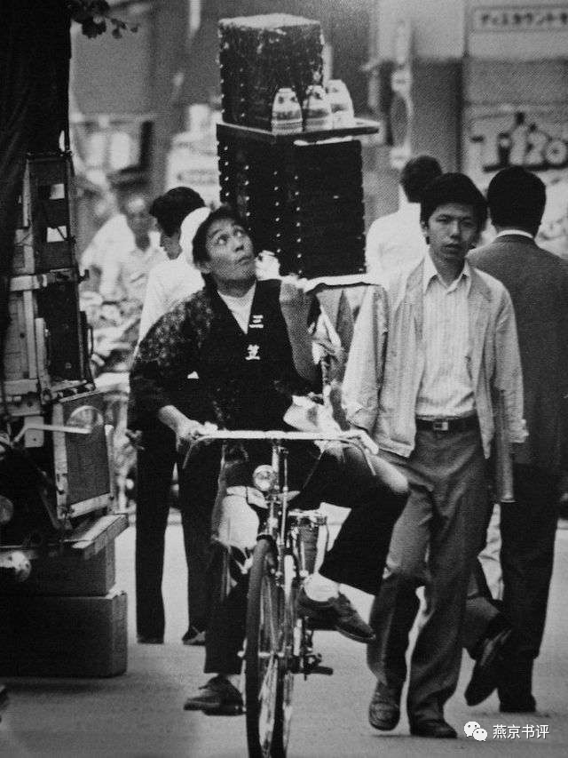 上世纪60年代,在人流中骑行的日本拉面外卖小哥。