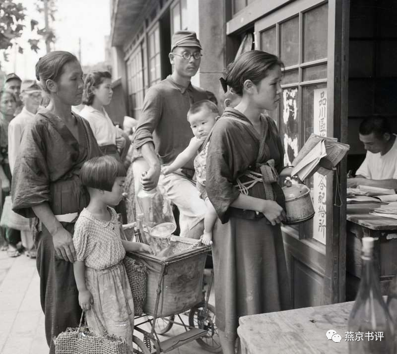 1945 年 9 月 21 日的日本东京,到处都是饥饿、肮脏和混乱。图为“配给日”时,日本平民带着手推车、罐子和袋子来到仓库,领取豆类配给。一位母亲拿出她的配给书,换取未来10天的豆子配额。