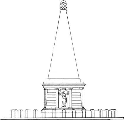 图8所示的这类修长的圆锥形圣石除了被作为神像崇拜外,还和一位具体的神祇有着密切关联:阿波罗阿古伊斯(Apollo Agyieus,Ἀπόλλων Ἀγυιεύς)。阿古伊斯来自古希腊语表示「街道」的ἄγυια一词,因此这个形态的阿波罗是一位掌管道路与公共空间安全的神祇。如果奥古斯都圆锥的设计灵感果真是来自圣石,那么它的定位就不仅仅是一块显眼的路标——它还是一个醒目的宗教符号。从它身边经过的人们,即使对历史与神话知之甚少,也能够大体领会到它的象征意义,在心里默念一句:阿波罗神正保佑着我。