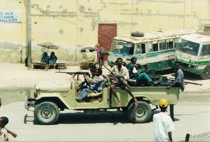对于这段历史,有一部著名的电影——2001年上映的《黑鹰坠落》。也正是它,将运载民兵的武装皮卡呈现给了全世界的公众。其故事的原型发生在1993年10月,当时,2架美军的黑鹰直升机被当地武装击落,这些直升机正运载着士兵前去缉拿一位名叫艾迪德(Aideed)的军阀,当时,这位军阀曾被美国政府视作威胁。