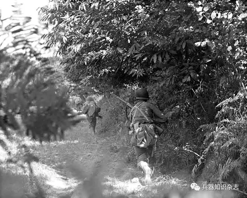 ▲ 一队美军巡逻士兵穿过博卡日地区典型的树丛前进,战斗在非常狭小的范围里发生。你根本无法弄清相邻的地带正在发生什么事情,更不用说几千米以外了