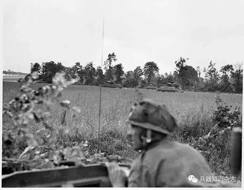 ▲ “谢尔曼”坦克在博卡日复杂而危险的地带前进。坦克前进的速度非常缓慢,因为每个树篱丛中都可能藏着一个机枪群、一门穿甲炮或一门88毫米的反坦克炮
