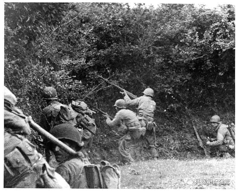▲ 美军部队在博卡日进行战斗,他们遭到了德军士兵的顽强阻击。盟军费了九牛二虎之力才将德军从其防御工事中赶出去。该图为美军士兵正用步枪和手榴弹来摧毁敌人在树篱中的阵地