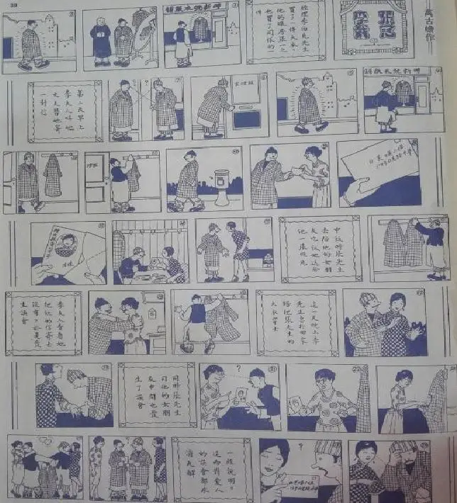 这组漫画说的是,经理李伯允在“时新号衣服铺”买了一件格子大衣,他的账房张一之也买了一件一样的,结果二人在办公室穿错衣服,引发了一个令人啼笑皆非的搞笑故事。不难发现大衣这一西式服装在当时的流行程度。