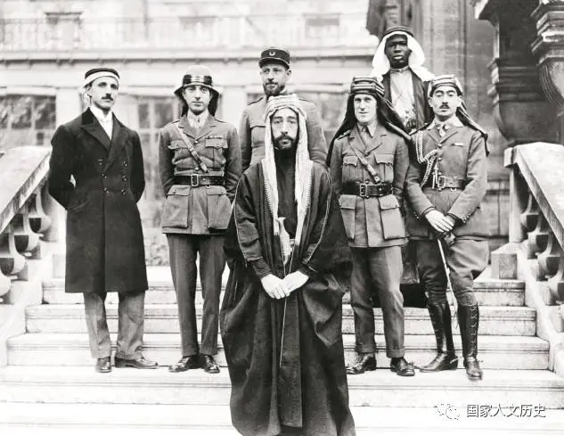 1919年,费萨尔·本·侯赛因和他的代表团成员以及顾问成员在凡尔赛宫外合影。他们此行是为参加巴黎和会而来。在他身后从左至右依次为私人秘书鲁斯捷姆·海达尔;准将努里·赛德;法国顾问皮萨尼上尉;英国顾问劳伦斯上校(即“阿拉伯的劳伦斯”);哈桑·卡德里