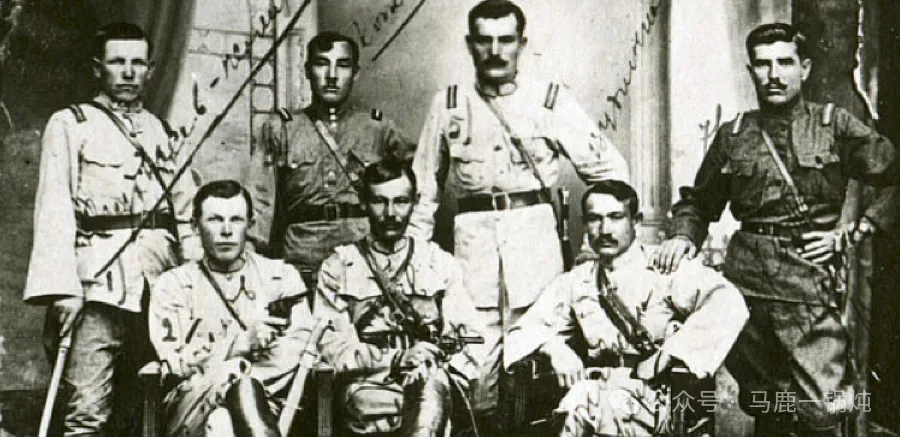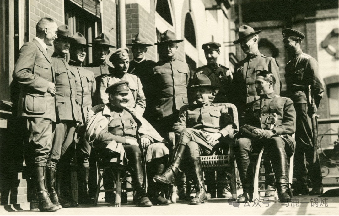 ■1918年,作为外贝加尔哥萨克的首领,白俄将军谢苗诺夫(前坐者左一)在海参崴与美国干涉军代表合影。