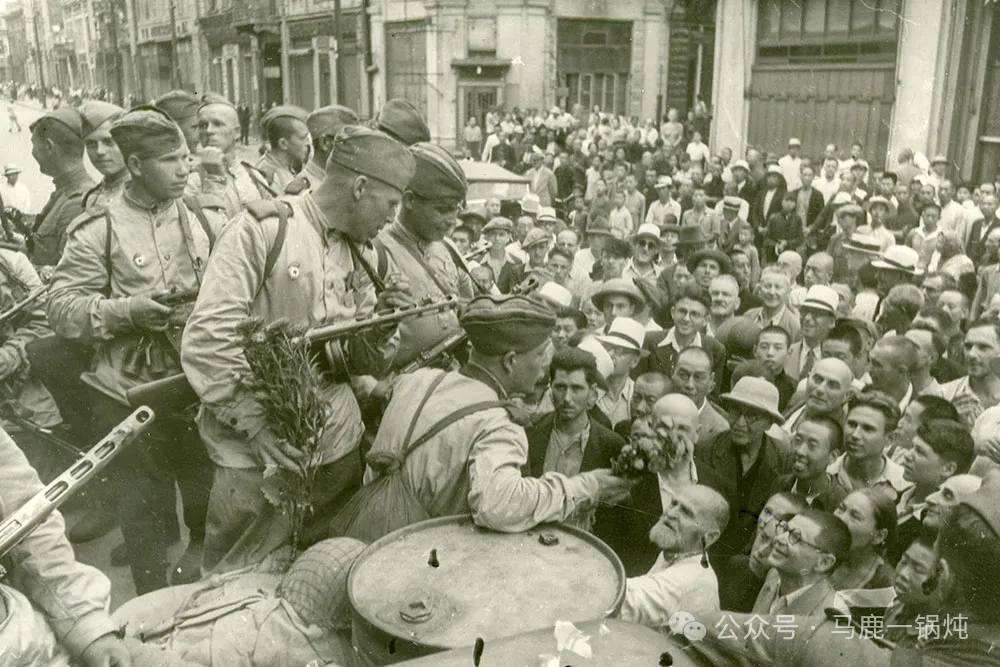 ■1945年8月,哈尔滨俄侨涌上街头,欢迎开进城市的苏联军队。