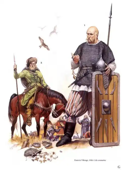 10世纪晚期在东方的维京商人和武士。注意他们使用的斯拉夫风格和中亚风格的服装和武器