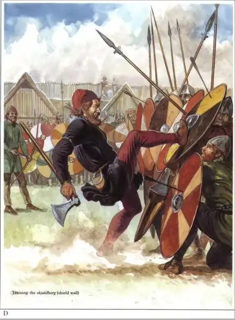 维京雇佣兵团的训练。注意穿红裤子的高等级雇佣兵在用设法把盾墙中的训练者踢出队列的方法测试盾墙的力度