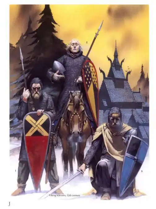 2世纪的维京武士。注意这些武士的装备风格已经发生了非常大的变化。他们的盾牌变为“风筝形”,而不是传统的圆盾。其锁子甲风格也受到了西方文化的影响