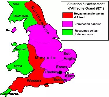 阿尔弗雷德在一系列的战争中建立了一支强大的军事力量。在阿尔弗雷德899年死后这支力量交到了他的继任者手中。借助着这支强大的军队“长者”爱德华和阿瑟尔斯坦收复了失去的领土。927年阿瑟尔斯坦赶走了占领约克的丹麦人国王罗格瓦尔德、西哈特里克和西哈特里克的儿子奥拉夫以及奥拉夫的顾问兼摄政者古斯弗里斯。939年古斯弗里斯的儿子奥拉夫【这是另一个奥拉夫!注意区分他与西哈特里克的儿子奥拉夫!!!】重新夺取约克以及“五个区”【这里就是上文提到的五个丹麦法区】。奥拉夫的堂哥奥拉夫西哈特里克松继承了王位。但是性格软弱的奥拉夫西哈特里克松又一次丢掉了国土,国土被南萨克逊国王夺取。