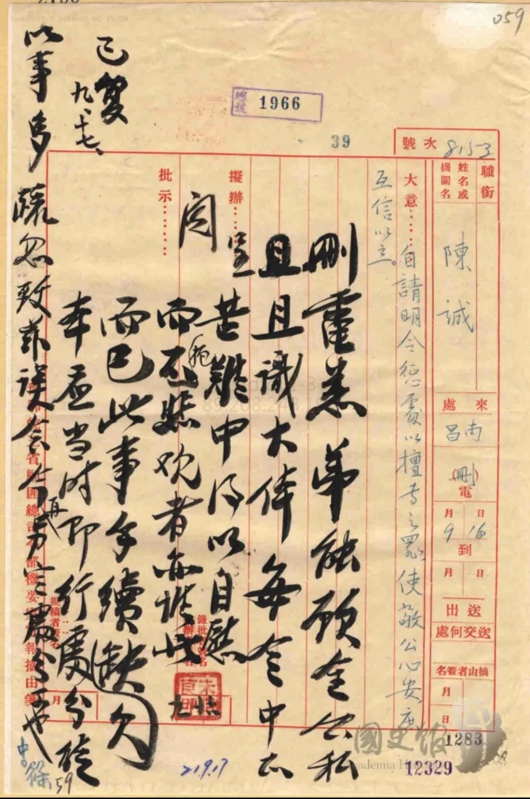 蒋介石手谕陈诚“另定处分”(台北“国史馆”馆藏档案)