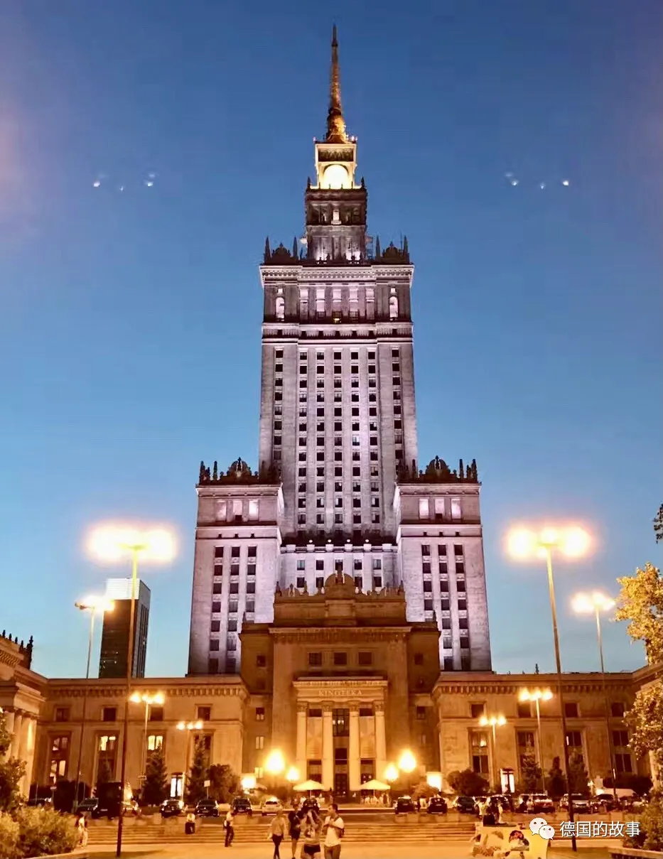 入夜由雅努什·科扎克纪念碑处回眺华沙科学文化大厦,大厦前广场上肖邦音乐会方才散场