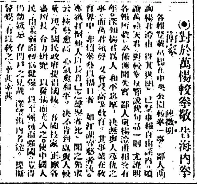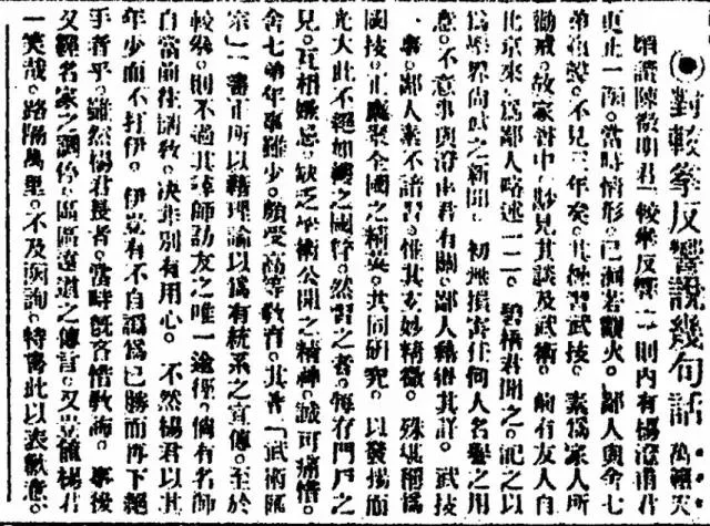 “顷读陈微明君《较拳反响》一则,内有杨澄甫君更正一函,当时情形,已洞若观火。鄙人与舍七弟籁声,不见三年矣,其练习武技,素为家人所劝戒,故家书中,尠见其谈及武卫。前有友人自北京来,为鄙人略述一二,碧梧君闻之,记之以为学界尚武之新闻。初无损害任何人名誉之用意,不意事与澄甫君有关。鄙人藉得其详。武技一事,鄙人表不谙习。惟其玄妙精微,殊堪称为国技。正应聚全国之精英,共同研究,以发扬而光大此不绝如缕之国粹。然习之者,每存门户之见,互相嫉忌,缺乏学术公开之精神,诚可痛惜。舍七弟年事虽少,颇受高等教育,其著《武术汇宗》一书,正所以藉理论以为有统系之宣传。至于较拳,则不过其寻师访友之唯一途径,倘有名师,自当前往请教,决非别有用心。不然杨君以其年少而不打伊,伊岂有不自讹为已胜而再下绝手者乎?虽然杨君长者,当时既吝惜教诲,事后又经名家之调停,区区远道之传言,又岂值杨君一笑哉。路隔万里,不及函询,特书此以表歉意”。