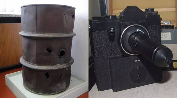 视觉布控 – 左:将照相机隐藏在废弃油桶中 右:特制针孔照相机