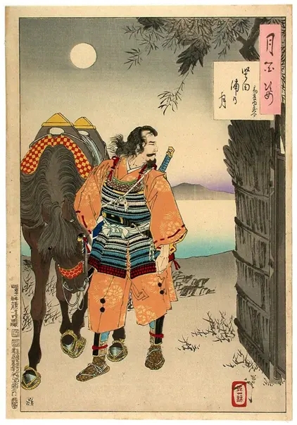 月色昏昏,一匹老马气喘吁吁,一名武士披头散发,他拼命逃到此地,已是末路穷途。他正是上一幅画的主人公斋藤利三,当时他还全副武装,戴着头盔、手套, 现在却是丢盔弃甲的亡命之徒了。