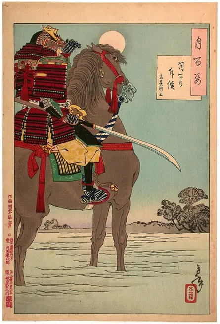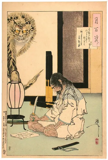 这边明智光秀也正紧张地布置着防务,明石仪太夫后悔自己没能击杀秀吉,放过了最好的战机,因此在光秀面前请罪自裁。月冈芳年的图画中,他席地而坐,刚刚写好了绝命诗,然后切腹而亡。他写道:“既为武士何违命,忍见夏夜月更明。”——我既然身为武士,就不能珍惜这能看到夏夜之月的生命。在我切腹之后,那月亮恐怕会比往日更加明亮吧?